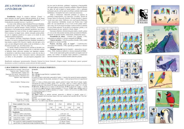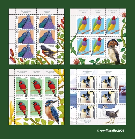 Romfilatelia adaugă la tematica dedicată „Faunei” o nouă emisiune de mărci poştale dedicată păsărilor de pe întreg mapamondul intitulată „Ziua internațională a păsărilor”, ce va fi introdusă în circulaţie miercuri, 5 aprilie a.c.