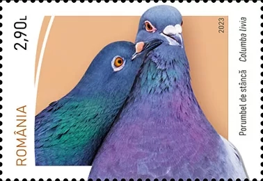 Porumbelul de stâncă – Columba livia (Gmelin, 1789), reprezentat pe timbrul cu valoarea nominală de 2,90 lei;