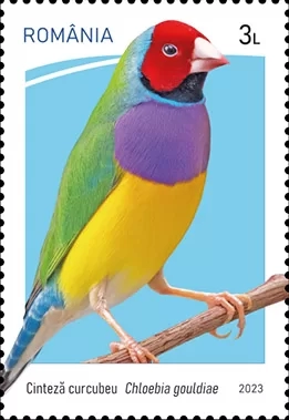 Cinteza curcubeu – Chloebia gouldiae (Gould, 1844), redată pe timbrul cu valoarea de 3 lei;
