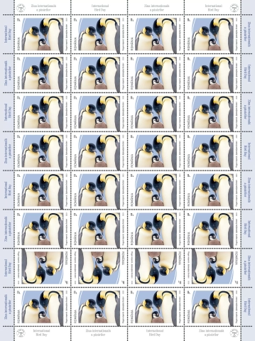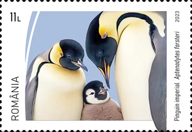 Pinguinul imperial (tată de familie) – Aptenodytes forsteri (Gray, 1844), ilustrat pe timbrul cu valoarea nominală de 11 lei.
