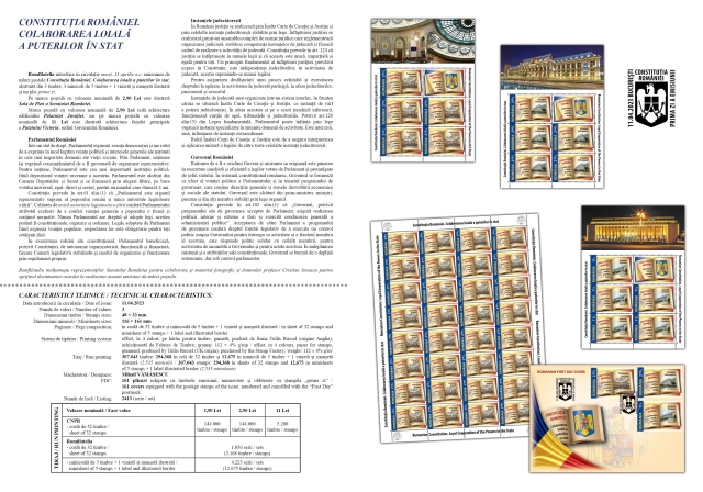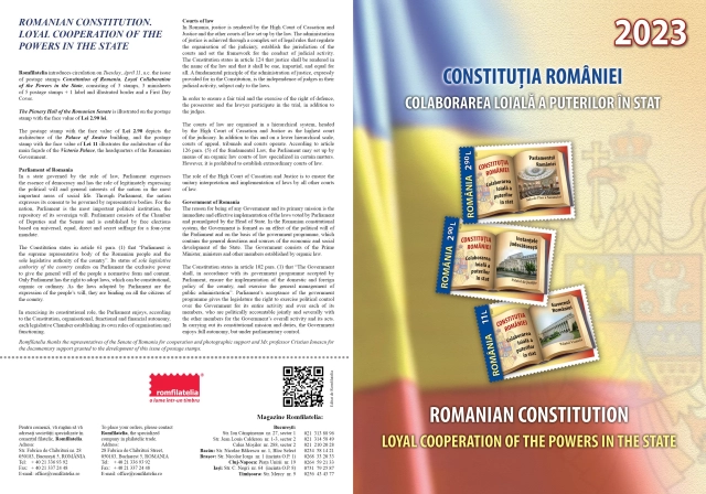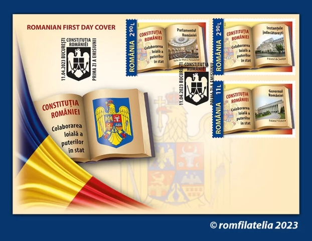 Romfilatelia introduce în circulație marți, 11 aprilie a.c. emisiunea de mărci poștale Constituția României. Colaborarea loială a puterilor în stat, alcătuită din 3 timbre, 3 minicoli de 5 timbre + 1 vinietă și manșetă ilustrată și un plic prima zi.