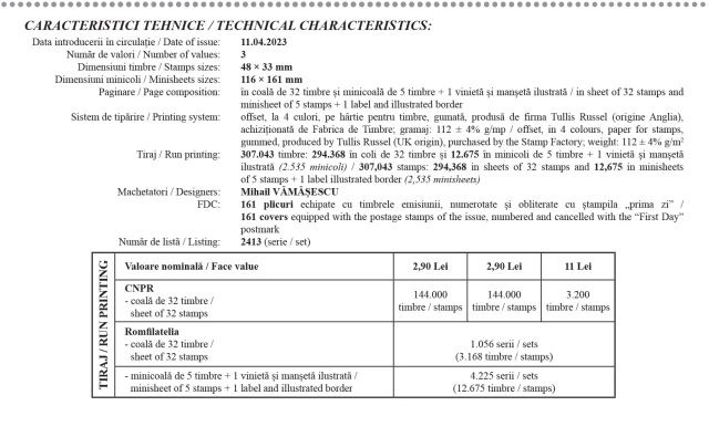 Emisiunea va fi disponibilă de marți, 11 aprilie, în rețeaua magazinelor Romfilatelia din București, Bacău, Brașov, Cluj-Napoca, Iași, Timișoara, precum și în magazinul nostru online: http://romfilatelia.ro/store/.