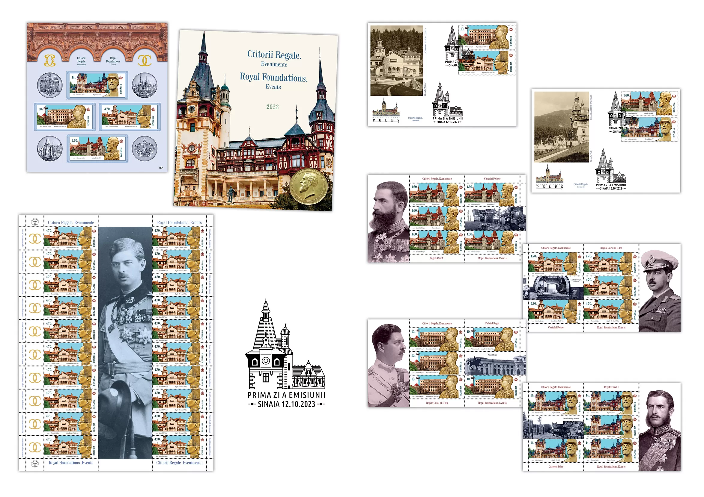 O nouă emisiune, a cărei tematică abordează un subiect legat de Dinastia Regală a României sub titlul generic „Ctitorii Regale. Evenimente”, va fi introdusă în circulație joi, 12 octombrie a.c. Imaginile celor patru mărci poștale reproduc arhitectura de ansamblu a construcțiilor ridicate la Sinaia, respectiv Castelul Peleș (val. nominală de 14 Lei), Castelul Pelișor ( val. nominală de 1,60 Lei), Castelul Foișor (val. nominală de 4,70 Lei), la care se adaugă Palatul Regal din București (val. nominală de 10 Lei). Compoziția grafică este întregită de detalii regăsite pe medaliile epocii care redau busturile regilor ctitori și construcțiilor amintite, în prezentarea arhitectonică de ansamblu, vizibilă în prezent.