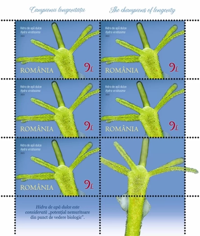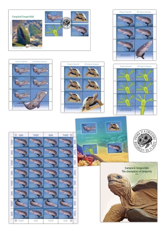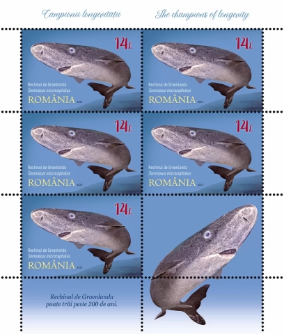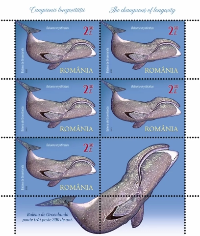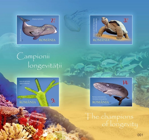 Mărcile poștale ale emisiunii reproduc imaginile balenei de Groenlanda (valoarea nominală de 2,30 lei), țestoasei de Seychelles (valoarea nominală de 3,50 lei), hidrei de apă dulce (valoarea nominală de 9 lei) și rechinului de Groenlanda (valoarea nominală de 14 lei). Longevitatea acestora este înscrisă între 200 și 400 de ani, exceptând hidra de apă dulce, considerată potențial nemuritoare.