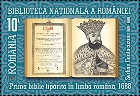 O astfel de operă, a cărei semnificaţie întru devenirea limbii române în forma ei cea mai aleasă nu poate fi uitată, este Biblia de la București sau Biblia lui Șerban Cantacuzino, prima biblie tipărită în limba română în anul 1688 (detaliu redat pe timbrul cu valoarea nominală de 10 lei).
