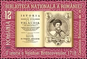 Pe timbrul cu valoarea nominală de 12 lei este redat un detaliu din cartea Istoria delle moderne rivoluzioni della Valachia: con la descrizione del paese; natura, costumi, riti, e religione degli abitanti …