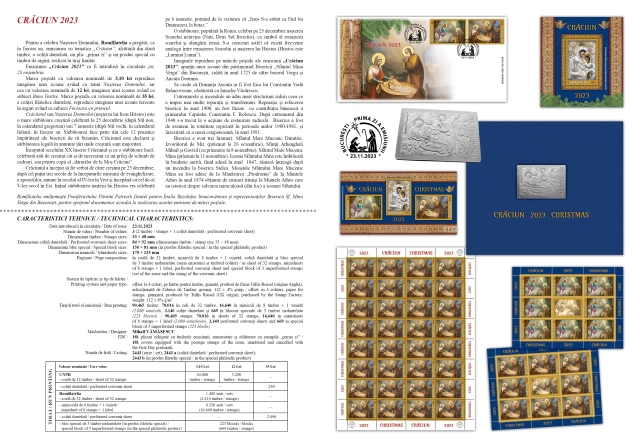Pentru a celebra Nașterea Domnului, Romfilatelia a pregătit, ca în fiecare an, emisiunea cu tematica „Crăciun”, alcătuită din două timbre, o coliță dantelată, un plic „prima zi” și un produs special cu timbru de argint, realizat în tiraj limitat. Emisiunea „Crăciun 2023” va fi introdusă în circulație joi, 23 noiembrie.