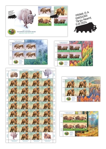 Imaginile mărcilor poștale cu valorile nominale de 2, 3, 6 și 25 Lei prezintă zimbrii în diverse ipostaze surprinse în stare de libertate în Rezervația Vânători Neamț, iar manșetele minicolilor reproduc imagini inedite ale peisajului teritoriului în care aceștia conviețuiesc.