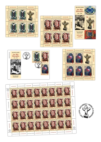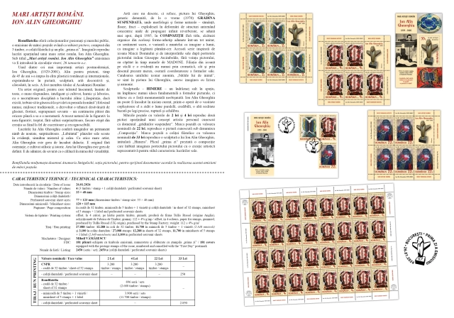 Mărcile poștale cu valorile de 2 lei și 4 lei reproduc două picturi aparținând unui concept artistic personal cunoscut ca domeniul „grădinilor suspendate”. Marca poștală cu valoarea nominală de 22 lei, reproduce o pictură cunoscută sub denumirea „Compoziție”. Marca poștală a coliței filatelice cu valoarea nominală de 33 lei reproduce o sculptură a lui Ion Alin Gheorghiu, intitulată „Himera”. Plicul „prima zi” prezintă o compoziție care îmbină imaginea portretului pictorului cu o creație artistică reprezentativă pentru stilul caracteristic lucrărilor sale.