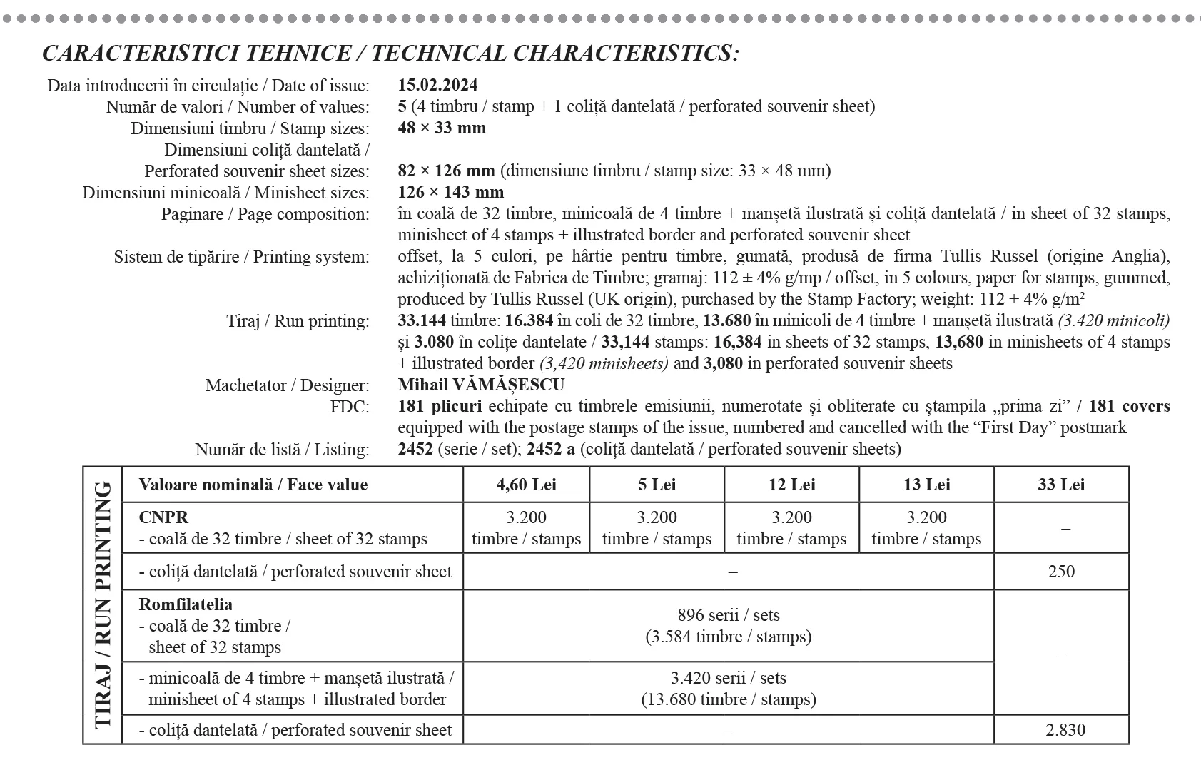 Sub titlul generic Orașele României, Giurgiu, emisiunea este compusă din patru mărci poștale, o coliță filatelică dantelată și un plic „prima zi”. Produsele emisiunii vor putea fi achiziționate din magazinele Romfilatelia, începând cu data de joi, 15 februarie a.c.