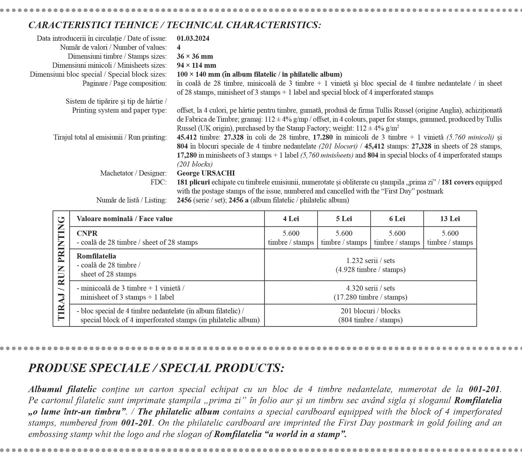 În acest an, în ziua de vineri, 1 Martie, Romfilatelia va introduce în circulație emisiunea de mărci poștale Ziua Mărțișorului, alcătuită din 4 timbre (cu valorile nominale de 4 lei, 5 lei, 6 lei și 13 lei), 1 plic „prima zi” și un produs special în tiraj limitat, inedite mărțișoare filatelice pentru toți prietenii timbrului românesc.