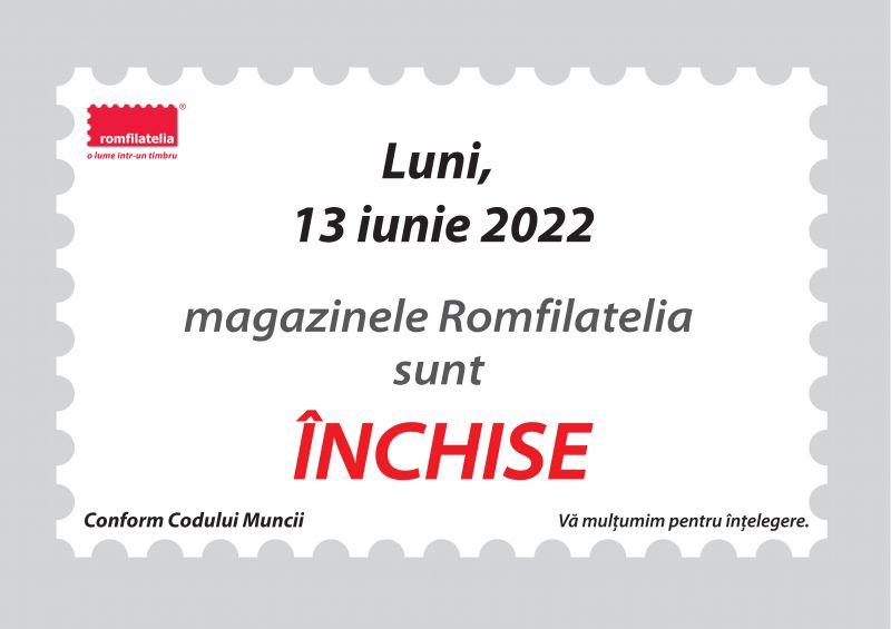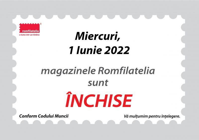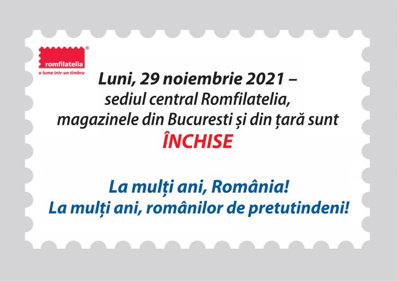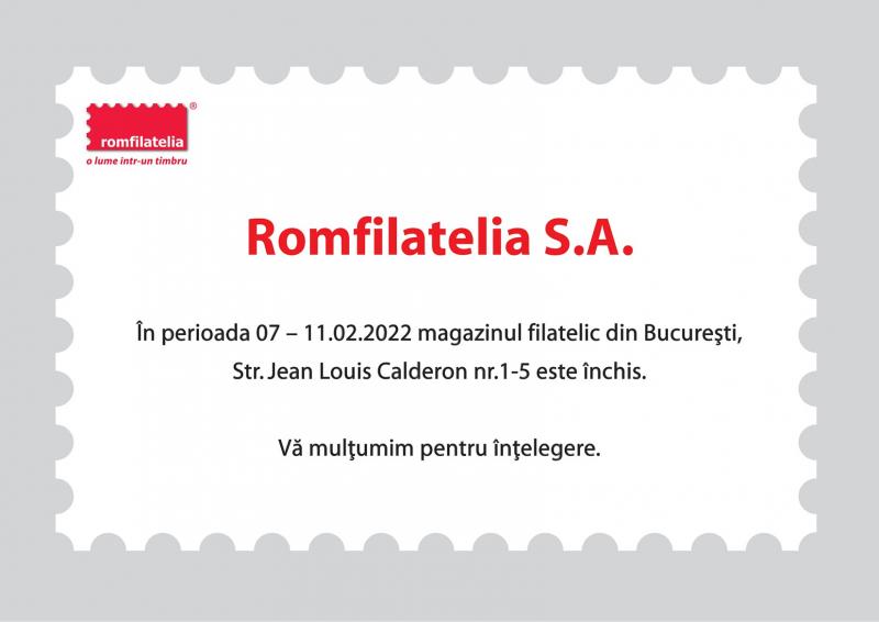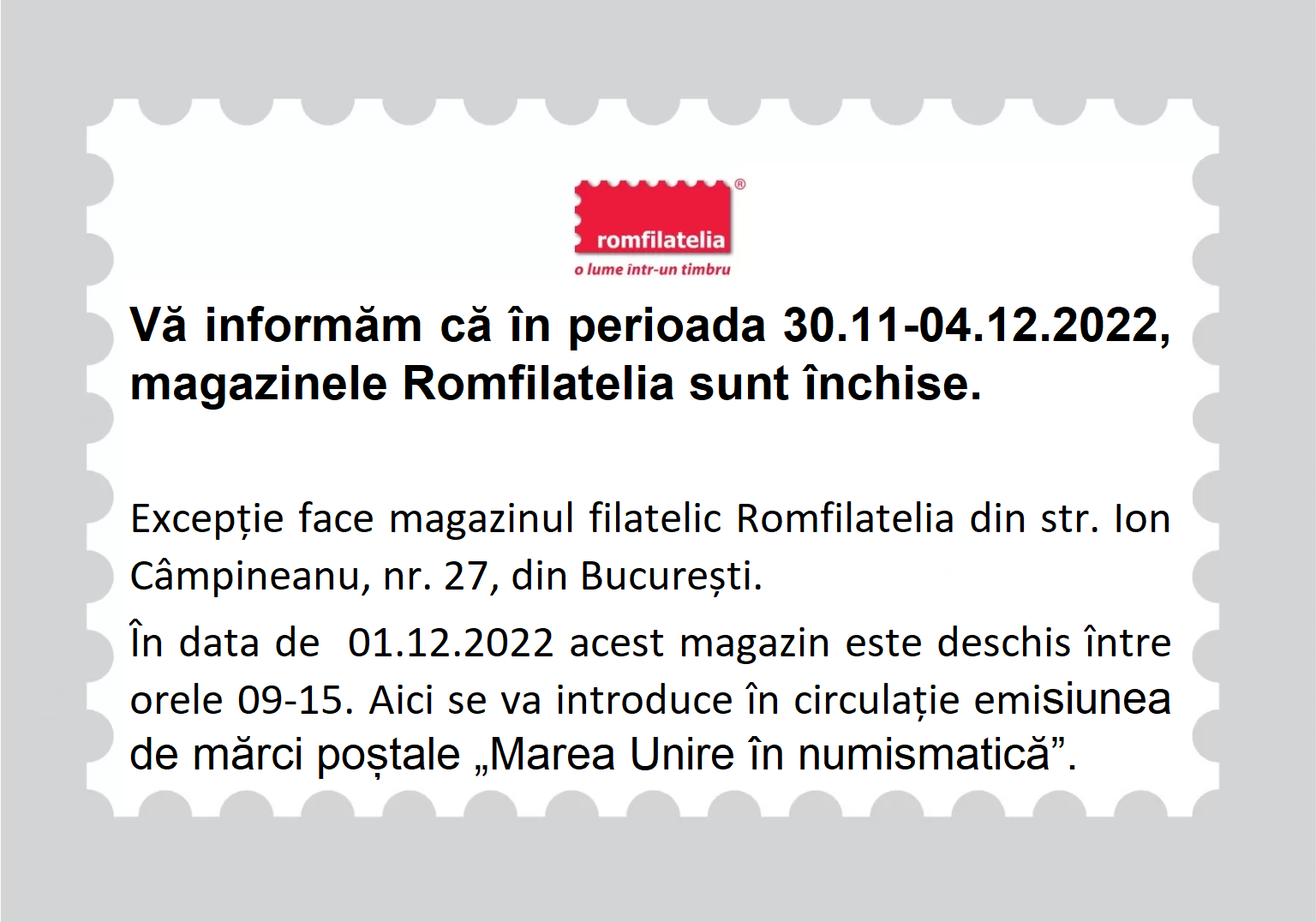 Vă informăm că în perioada 30.11-04.12.2022, magazinele Romfilatelia sunt închise.