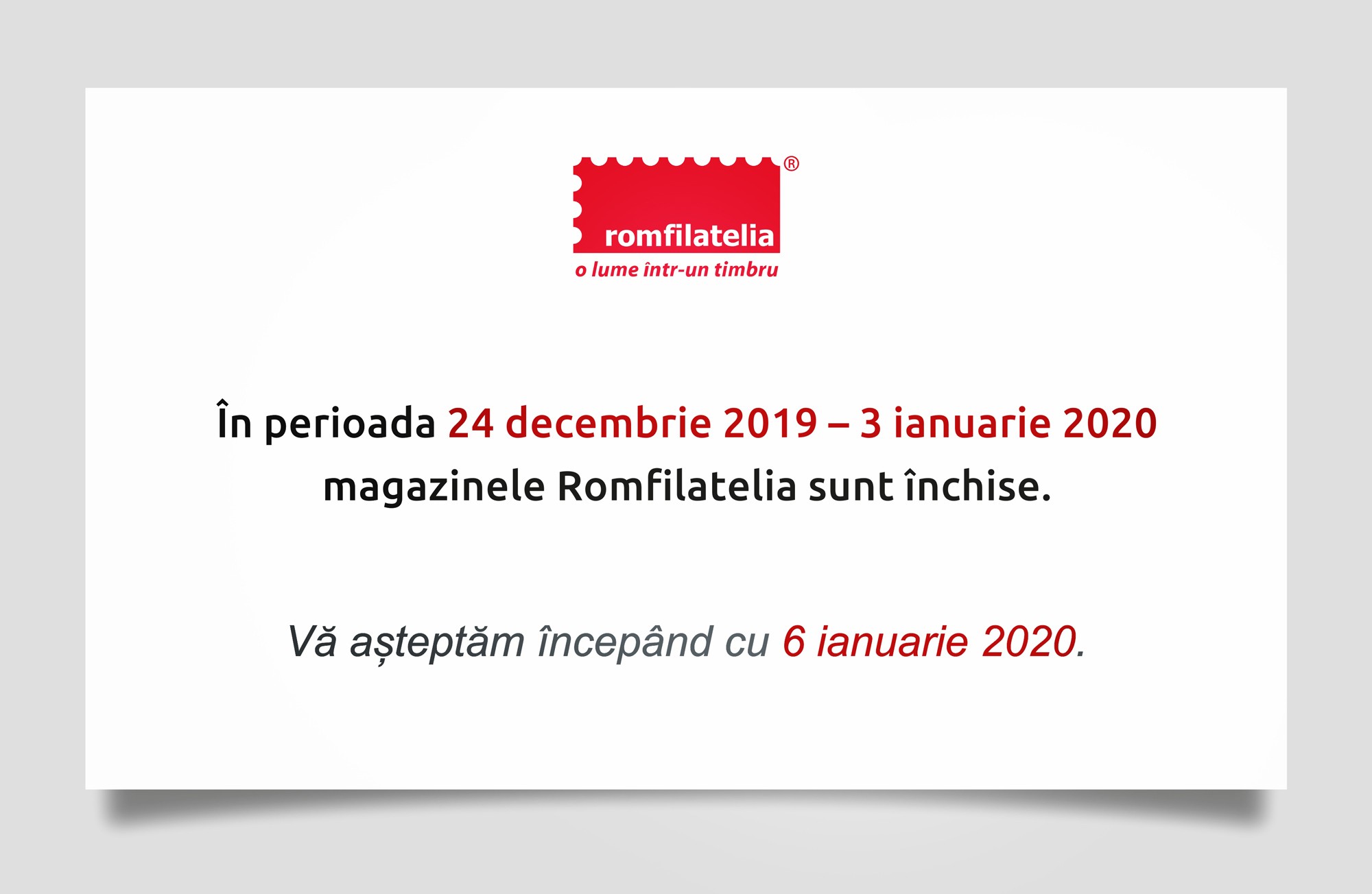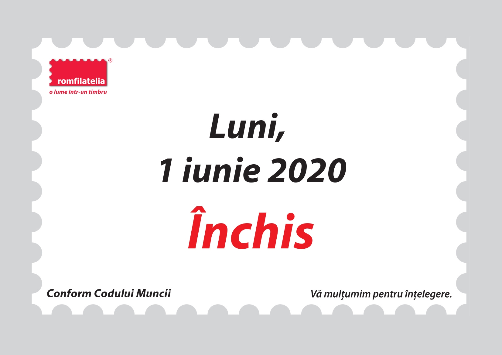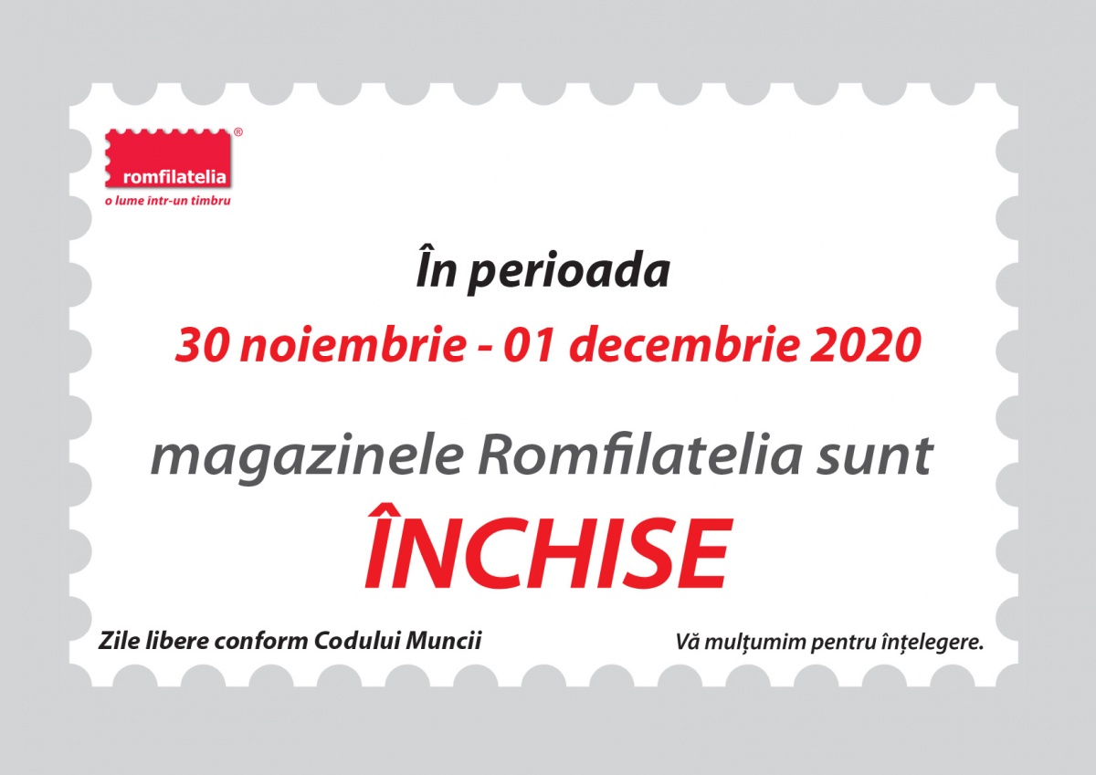 Dragi filateliști și colaboratori, După cum deja știți, pentru limitarea efectelor extinderii epidemiei virale (COVID-19), la nivel național s-au impus măsuri excepționale. Noi suntem dedicați publicului nostru și considerăm că despărțirea noastră fizică nu trebuie să însemne și despărțirea noastră, chiar și pe o perioadă determinată, în planul legăturilor afective, spirituale, de încredere și de