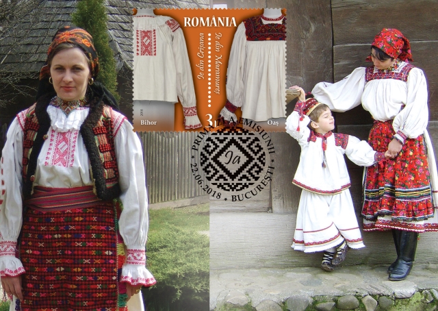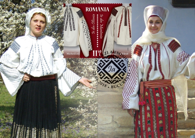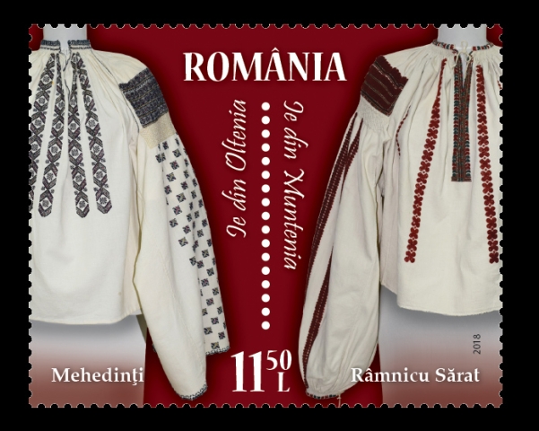 The fourth stamp of the issue, with the face value of Lei 11.50, illustrates the blouses specific to Oltenia (Mehedinti) and Muntenia (Ramnicu Sarat) regions.