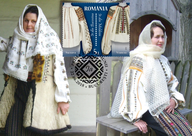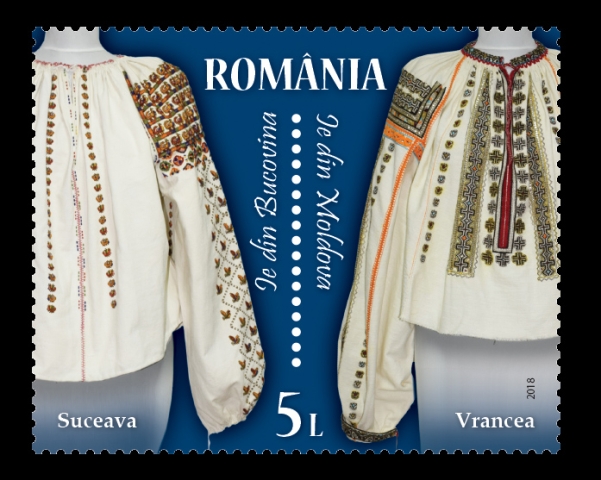 Two other traditional pieces belonging to the regions of Bucovina (Suceava) and Moldova (Vrancea) are illustrated on the stamp with the face value of Lei 5.