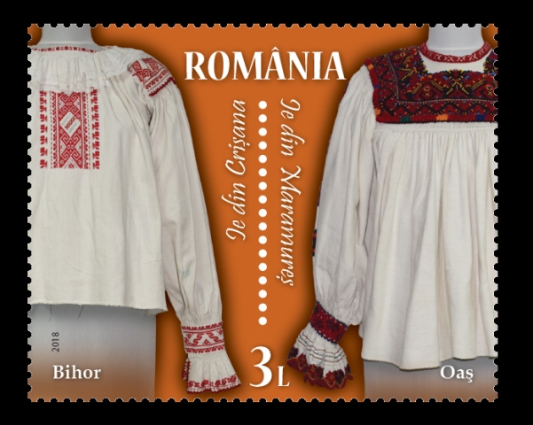 The folk blouses that is specific to Crisana (Bihor), respectively Maramures (Oas) regions are represented on the stamp with the face value of Lei 3.