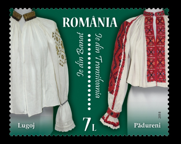The blouses specific to Banat (Lugoj) and Transylvania (Padureni, Hunedoara County) regions are represented on the stamp with the face value of Lei 7.