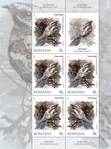 Species present on most of the European continent, the European nightjar (Caprimulgus-europaeus), illustrated on the stamp with the face value of Lei 5, is characteristic of open and arid areas, represented by open wood areas of coniferous forests or mixed forests and pasture-lands. A population of 12,000-15,000 pairs of birds is estimated in Romania, with the largest number being found in Russia, Turkey, Spain and France. It winters in Africa.