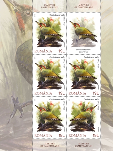 The European Green Woodpecker (Picus viridis), also known in Romania as “ghionoaia verde”, represented on the stamp with the face value of Lei 19, is part of the Piciformes order and the Picidae family. Is one of the most widespread woodpeckers in Central Europe, Northwest Africa, Asia Minor, Iran. In Romania, it is present throughout the year and is commonly met in broad-leaved forests with openings, but also in parks and open areas with clumps of trees.