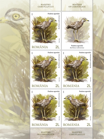 The Stone-curlew (Burhinus oedicnemus), represented on the stamp with the face value of Lei 2, is a species present in the Southern and Eastern part of Europe, characteristic of the steppe open areas, pasture-lands and agricultural crops. In Romania, it nests in the arid regions of Dobruja, the sandy grinds of the Danube Delta and some areas in the south of the country. In the cold season, it winters in Africa.