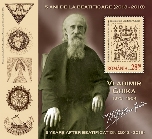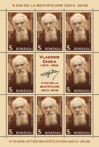 On the occasion of the fifth celebration of the beatification of Monsignor Vladimir Ghika (1873-1954), by the Roman Catholic Church, Romfilatelia introduces into circulation a commemorative postage stamp issue dedicated to the monk-prince’s martyrdom. On the stamp of the issue, with the face value of Lei 5, a portrait of the Blessed Vladimir Ghika, performed during a mission in Japan (1933), is illustrated. On the perforated souvenir sheet of the issue, with the face value of Lei 28.50, another picture of the Blessed was reproduced. The stamp of the souvenir sheet is a postage mark designed by Vladimir Ghika, in 1918, containing heraldic elements of the historical regions of Greater Romania.