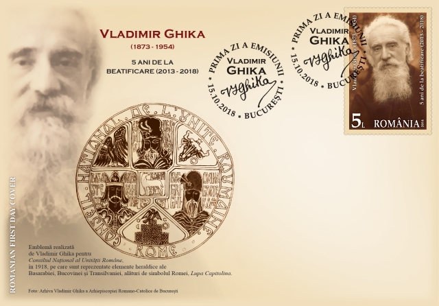 In 1918, the Monsignor participated in the lobbying activities initiated by the National Council of Romanian Unity, based in Paris. On September 28th, 1918, Vladimir Ghika was officially appointed by the Council to represent Romania in relation to the Holy See. In this capacity, he informed the Holy Father the news of the Great National Assembly in Alba Iulia on December 1st, 1918. In Rome to represent the union interests, Vladimir Ghika also made some thematic drawings, including stamp projects containing the heraldic elements of the Romanian historical regions and an emblem of the National Council of Romanian Unity, which was represented symbols of the new regions joined to the Kingdom of Romania, namely Transylvania, Bessarabia and Bukovina. This emblem is on the First Day Cover of the postage stamp issue Vladimir Ghika, 5 years after beatification.