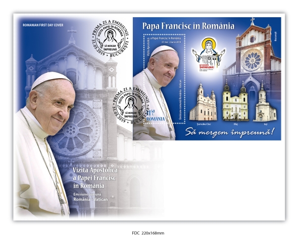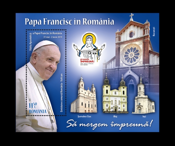 The postage stamps issue 2019 Romania-Vatican Joint Stamp Issue. The Apostolic Visit of Pope Francis to Romania. will be available on Friday, May 31th 2019, in Romfilatelia’s shops network in Bucharest, Bacau, Brasov, Cluj-Napoca, Iasi and Timisoara and online on http://romfilatelia.ro/store/. The postage stamps issue is completed by 1 “first day” cover, and as page composition with perforated souvenir sheet.
