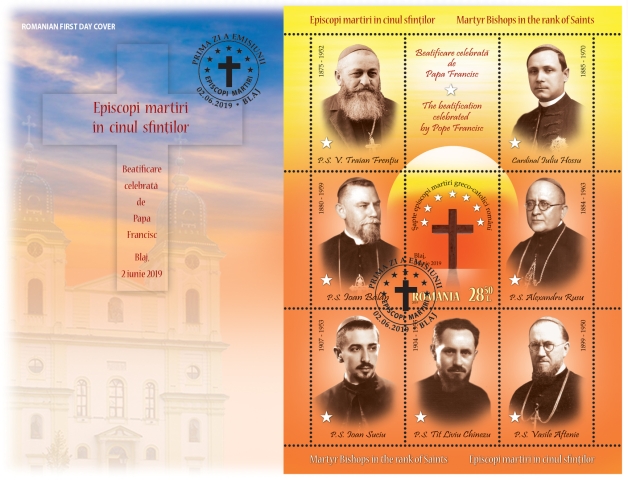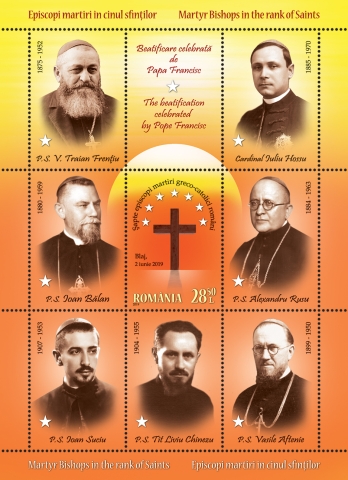 The martyr bishops to be beatified are : Valeriu Traian Frentiu, Vasile Aftenie, Ioan Suciu, Tit Liviu Chinezu, Ioan Balan, Alexandru Rusu, and Iuliu Hossu. Their names are illustrated near the portrait images of the perforated souvenir sheet with a the face value of Lei 28.50, where they are represented as a symbol of the sacrifice and the passage into light of the souls of those deceased, depicted by the seven-star crown in the vicinity of the cross.