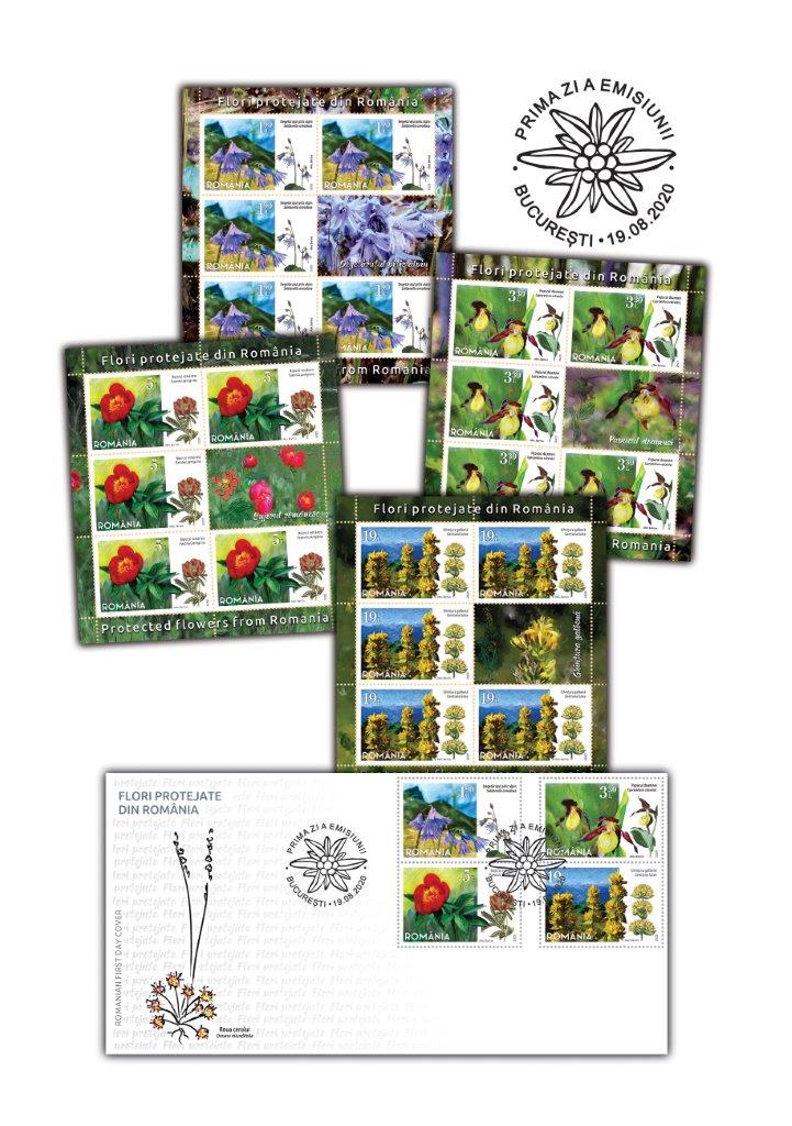 The postage stamps issue Protected flowers from Romania will be available on Wednesday, August 19th 2020, in Romfilatelia’s shops network in Bucharest, Bacau, Brasov, Cluj-Napoca, Iasi and Timisoara and online on http://romfilatelia.ro/store/. The postage stamps issue is completed by the First Day Cover, in sheet of 32 stamps and minisheet of 5 stamps + 1 label.