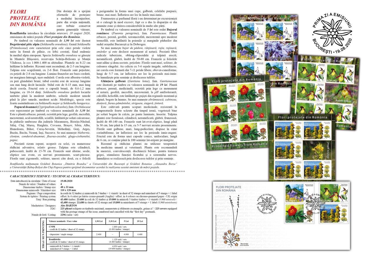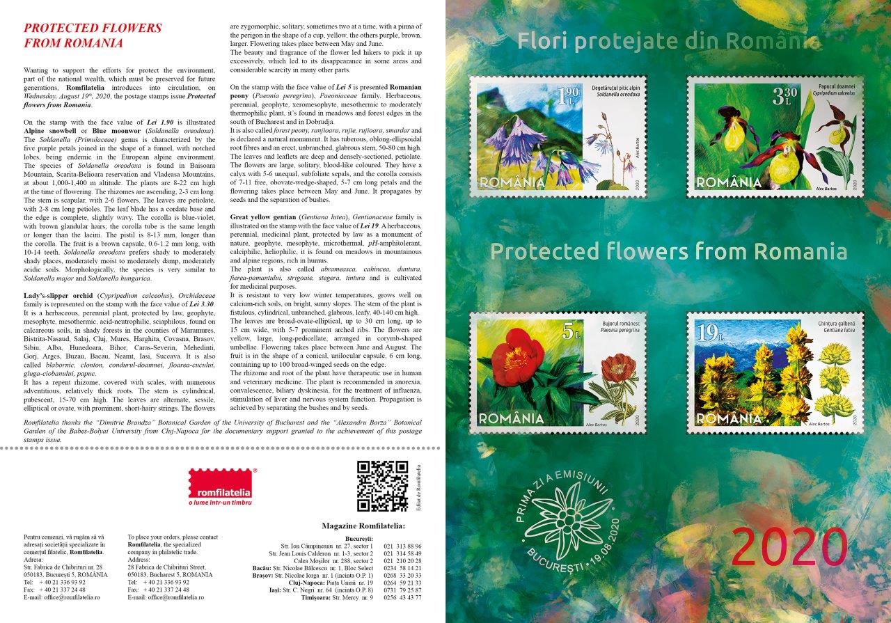 Wanting to support the efforts for protect the environment, part of the national wealth, which must be preserved for future generations, Romfilatelia introduces into circulation, on Wednesday, August 19th, 2020, the postage stamps issue Protected flowers from Romania.