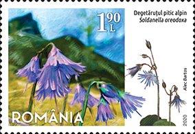 On the stamp with the face value of Lei 1.90 is illustrated Alpine snowbell or Blue moonwor (Soldanella oreodoxa). The Soldanella (Primulaceae) genus is characterized by the five purple petals joined in the shape of a funnel, with notched lobes, being endemic in the European alpine environment. The species of Soldanella oreodoxa is found in Baisoara Mountain, Scarita-Belioara reservation and Vladeasa Mountains, at about 1,000-1,400 m altitude. The plants are 8-22 cm high at the time of flowering. The rhizomes are ascending, 2-3 cm long. The stem is scapular, with 2-6 flowers. The leaves are petiolate, with 2-8 cm long petioles. The leaf blade has a cordate base and the edge is complete, slightly wavy. The corolla is blue-violet, with brown glandular hairs; the corolla tube is the same length or longer than the lacini. The pistil is 8-13 mm, longer than the corolla. The fruit is a brown capsule, 0.6-1.2 mm long, with 10-14 teeth. Soldanella oreodoxa prefers shady to moderately shady places, moderately moist to moderately damp, moderately acidic soils. Morphologically, the species is very similar to Soldanella major and Soldanella hungarica.