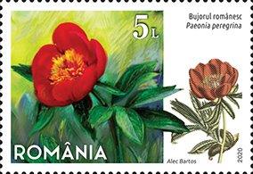 On the stamp with the face value of Lei 5 is presented Romanian peony (Paeonia peregrina), Paeoniaceae family. Herbaceous, perennial, geophyte, xeromesophyte, mesothermic to moderately thermophilic plant, it’s found in meadows and forest edges in the south of Bucharest and in Dobrudja.