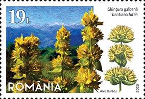 Great yellow gentian (Gentiana lutea), Gentianaceae family is illustrated on the stamp with the face value of Lei 19. A herbaceous, perennial, medicinal plant, protected by law as a monument of nature, geophyte, mesophyte, microthermal, pH-amphitolerant, calciphilic, heliophilic, it is found on meadows in mountainous and alpine regions, rich in humus.