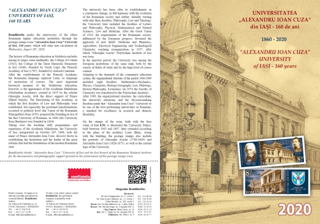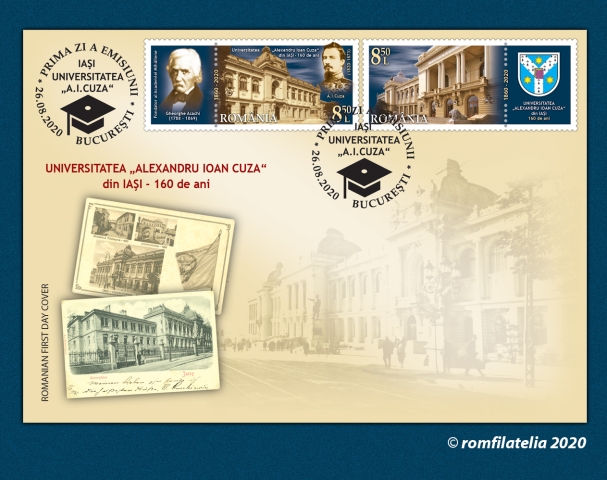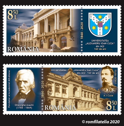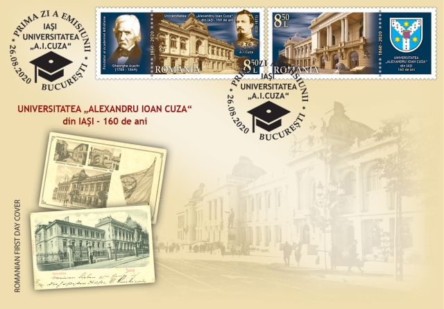 Romfilatelia marks the anniversary of the oldest Romanian higher education institution through the postage stamps issue “Alexandru Ioan Cuza” University of Iasi, 160 years, which will enter into circulation on Wednesday, August 26th, 2020.