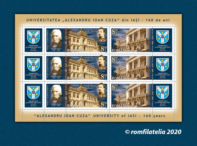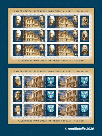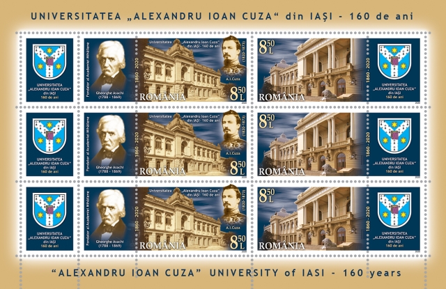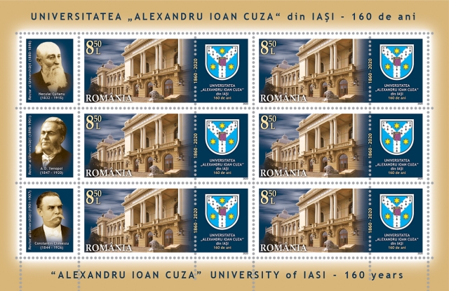 The postage stamps issue “Alexandru Ioan Cuza” University of Iasi, 160 years will be available on Wednesday, August 26th 2020, in Romfilatelia’s shops network in Bucharest, Bacau, Brasov, Cluj-Napoca, Iasi and Timisoara and online on http://romfilatelia.ro/store/. The postage stamps issue is completed by the First Day Cover, sheet of 30 stamps minisheet of 6 stamps + 3 labels and block of 6 stamps (3 sets) + 3 labels.