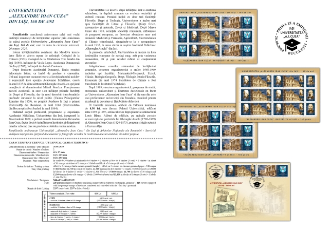 Romfilatelia thanks “Alexandru Ioan Cuza” University of Iasi and the Iasi branch of the Romanian National Archives for the documentary and photographic support granted to the achievement of this postage stamps issue.