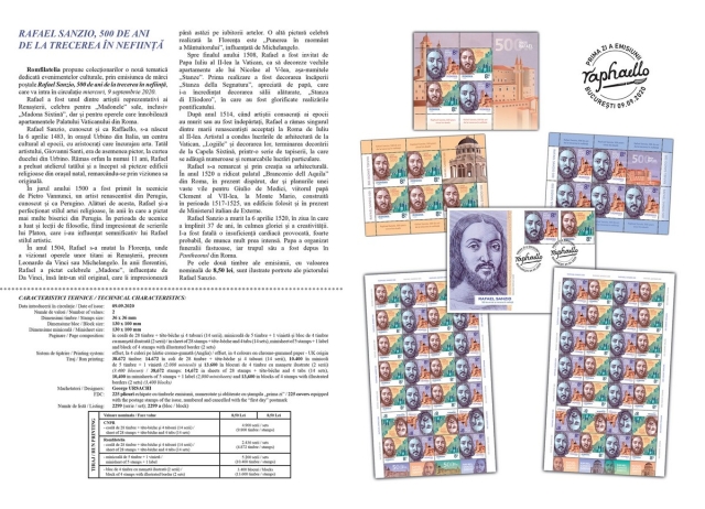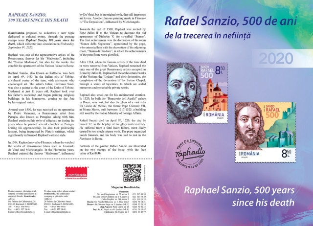 Romfilatelia proposes to collectors a new topic dedicated to cultural events, through the postage stamps issue Raphael Sanzio, 500 years since his death, which will enter into circulation on Wednesday, September 9th, 2020.