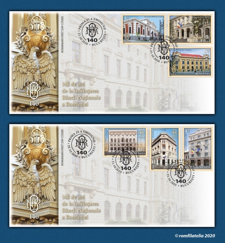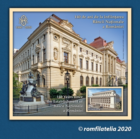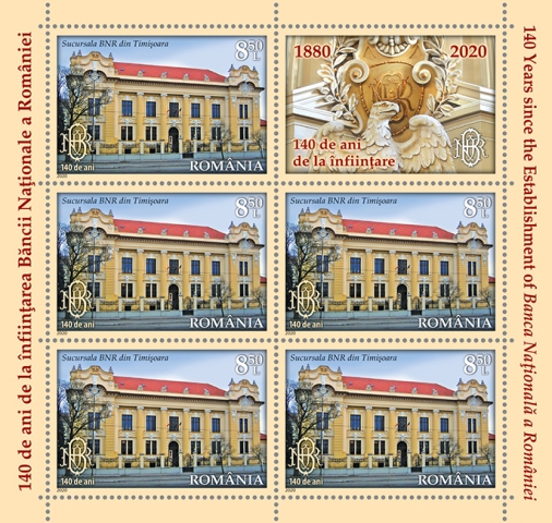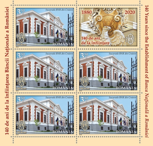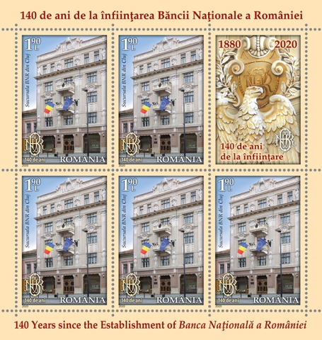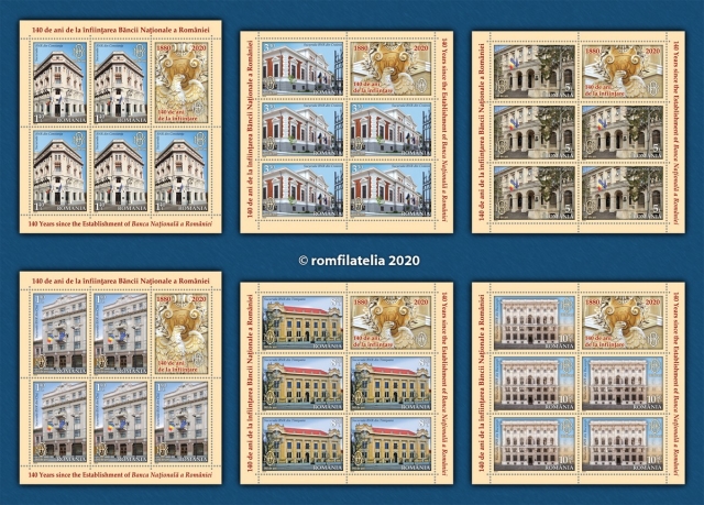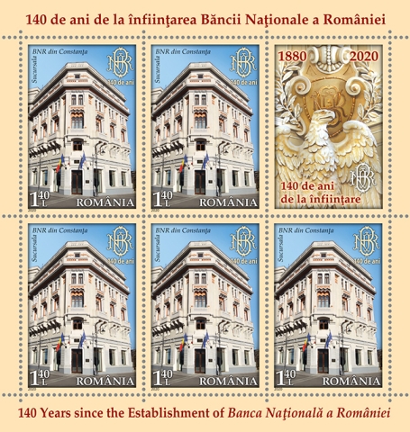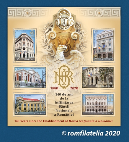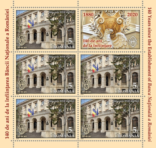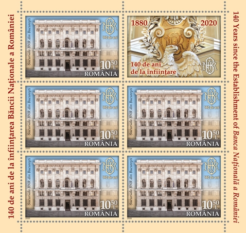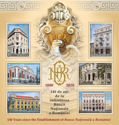 The postage stamps issue “140 Years since the Establishment of Banca Națională a României” will be available on Wednesday, October 21st 2020, in Romfilatelia’s shops network in Bucharest, Bacau, Brasov, Cluj-Napoca, Iasi and Timisoara and online on http://romfilatelia.ro/store/. The postage stamps issue is completed by two “first day” covers, sheet of 32 stamps, minisheet of 5 stamps + 1 label, imperforated souvenir sheet and block of 6 different stamps.