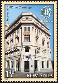 The postage stamp with the face value of Lei 1.40 reproduces the architecture of the building of the BNR Branch in Constanța.
