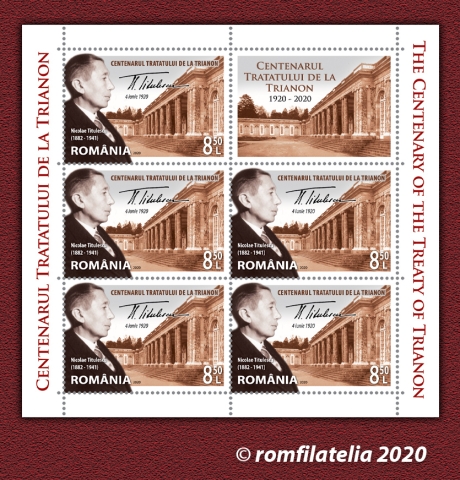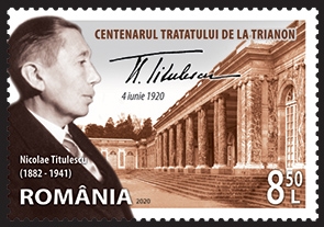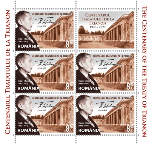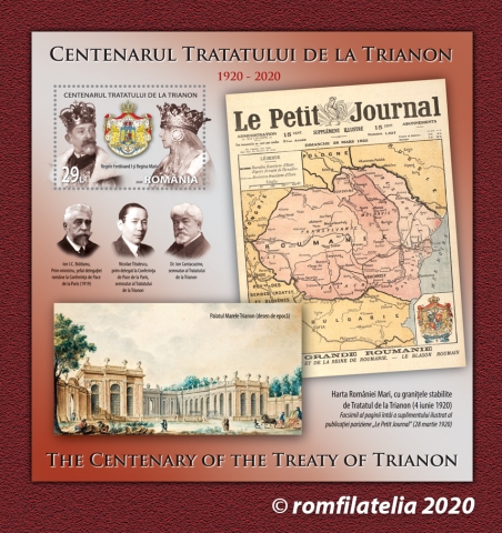 The first postage stamp of the series having the face value of Lei 8.50 reproduces Nicolae Titulescu’s portrait, a signatory of Trianon Treaty, and the perforated souvenir sheet containing the stamp with the face value of Lei 29 consists in a graphic ensemble where the Palace of Trianon is put next to Romania map made by Emmanuel de Martonne and reproduced in the Parisian publication “Le Petit Journal”. The stamp of the perforated souvenir sheet reproduces the portraits of Ferdinand I and Queen Marie next to the coat of arms of Greater Romania. Within the space of the perforated souvenir sheet one may see the portraits of the Romanian personalities present at the proceedings of the Peace Conference, namely Ion. I. C. Bratianu, Nicolae Titulescu, and Dr. Ion Cantacuzino.