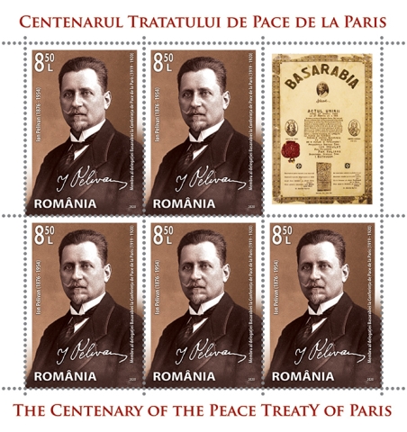 The second postage stamp having the face value of Lei 8.50 reproduces the portrait of the head of Bessarabian delegation at the Peace Conference of Paris, Ion Pelivan, and the stamp of the imperforated souvenir sheet having the face value of Lei 29 reproduces Take Ionescu’s portrait, in a graphic ensemble with the Act of Union of Bessarabia with Romania bearing the date of March 27, 1918.