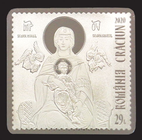 The special product, with silver stamp, reunites in an original presentation the collectible philatelic block that contains three imperforated stamps (the series and the stamp of the souvenir sheet), created in a limited run printing of 251 pieces, the replica molded in silver of the postage stamp of the imperforated souvenir sheet depicting the Icon “The Mother of Our Lord with Baby Jesus” and a Certificate of Authenticity issued by the State Mint, all numbered from 001 to 251.