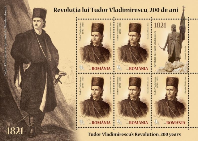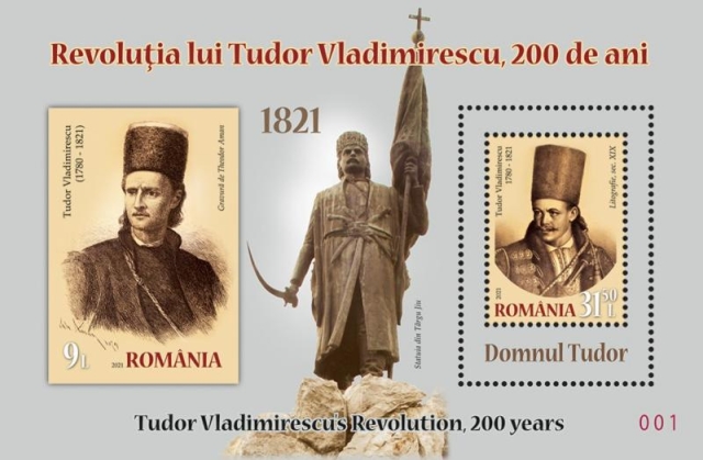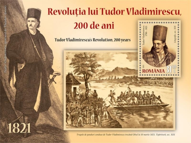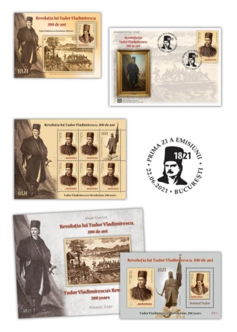 The postage stamps issue Tudor Vladimirescu’s Revolution, 200 Years, consisting of a stamp, a perforated souvenir sheet, a special anniversary block and a “First Day” Cover, is part of a series of projects designed to pay tribute to the hero and celebrate the Year of Tudor Vladimirescu.