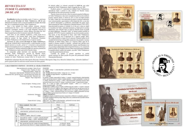 Romfilatelia introduces into circulation, on Tuesday, June 22nd this year, the postage stamps issue entitled “Tudor Vladimirescu’s Revolution, 200 Years”, dedicated to a historical moment and an exceptional personality: the Revolution of 1821 and its leader, Tudor Vladimirescu.