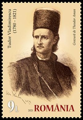 The stamp with the face value of Lei 9.00 reproduces the portrait of Tudor Vladimirescu, after an engraving by Theodor Aman.