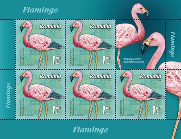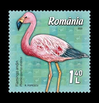 Flamingo andin (Phoenicoparrus andinus), ilustrat pe timbrul cu valoarea nominală de 1,40 lei, trăiește în preajma lacurilor montane din Anzi, în Peru, Argentina și Chile, adesea în colonii mixte, alcătuite din mai multe specii sud-americane de flamingi. Este o specie vulnerabilă, amenințată de mineritul practicat în zonă (care duce la poluarea apelor), de turism și dezvoltarea infrastructurii (care deranjează coloniile) și de colectarea ouălor de către localnici.