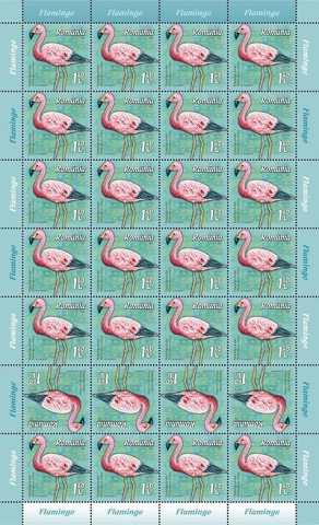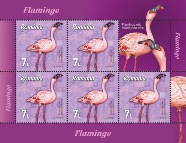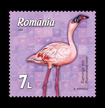 Flamingo mic (Phoeniconaias minor), reprezentat pe timbrul cu valoarea nominală de 7 lei, trăiește în Africa sub-sahariană și în nord-vestul Indiei. Este cea mai mică dintre speciile de flamingo (80-90 cm înălțime). Deși are cele mai numeroase populații dintre toate speciile de flamingi, este considerat, totuși, o specie aproape amenințată (conform clasificării Uniunii Internaționale pentru Conservarea Naturii), populațiile fiind în declin, în special datorită poluării apelor.