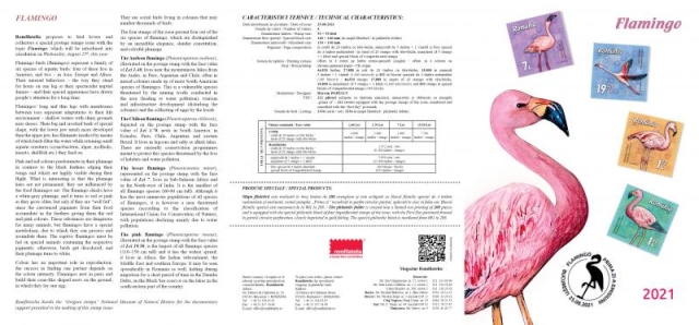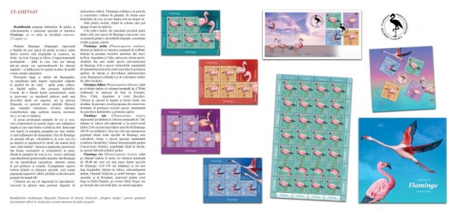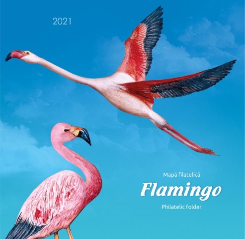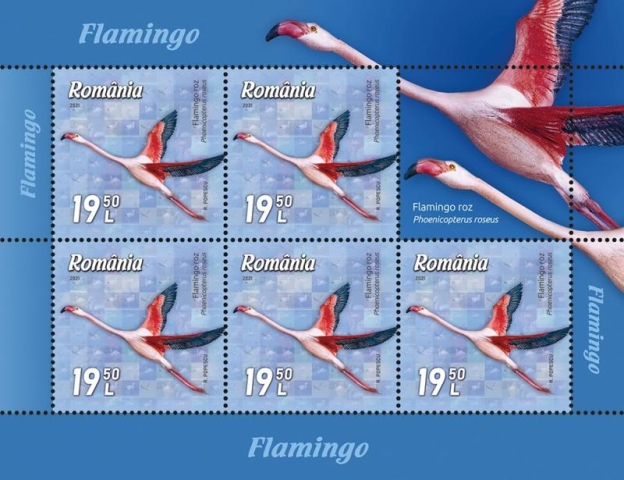 Flamingo roz (Phoenicopterus roseus), redat pe ultimul timbru al seriei cu valoarea nominală de 19,50 lei, este cea mai mare dintre speciile de flamingo (110–150 cm înălțime) și cel mai larg răspândită; trăiește în Africa, subcontinentul indian, Orientul Mijlociu și sudul Europei. Apare sporadic și în România, poposind pentru scurt timp în Delta Dunării, pe coasta Mării Negre sau pe lacurile din sud-estul țării, în cursul migrației.