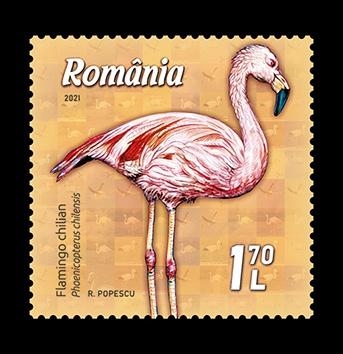 Flamingo chilian (Phoenicopterus chilensis), redat pe al doilea timbru cu valoarea nominală de 1,70 lei, cuibărește în America de Sud, în Ecuador, Peru, Chile, Argentina și estul Braziliei. Trăiește în special în lagune și lacuri sărate sau alcaline. În prezent, există programe de conservare destinate să protejeze această specie, amenințată de pierderea habitatelor și poluarea apelor.