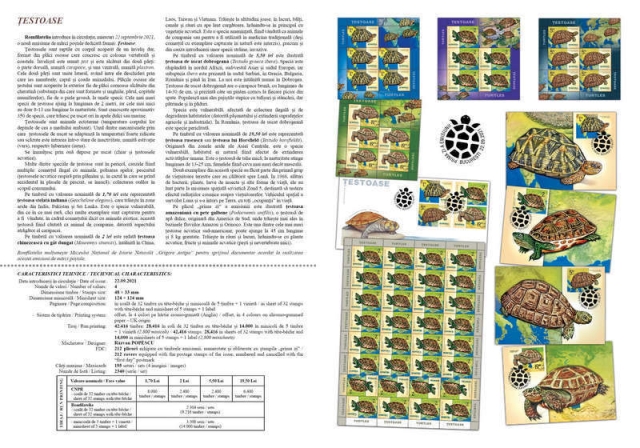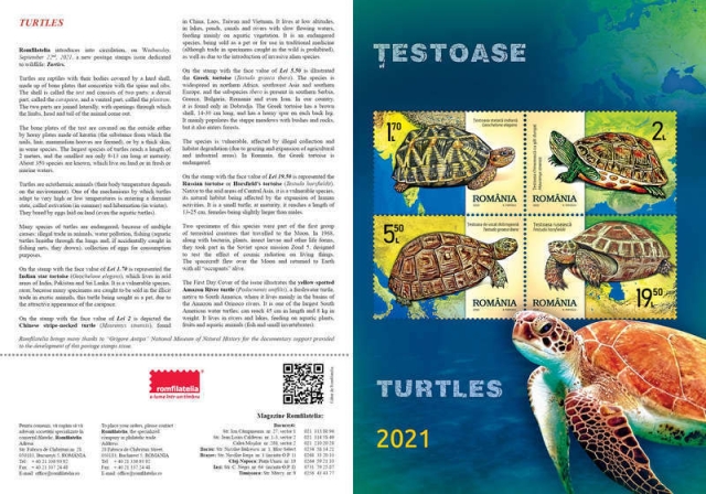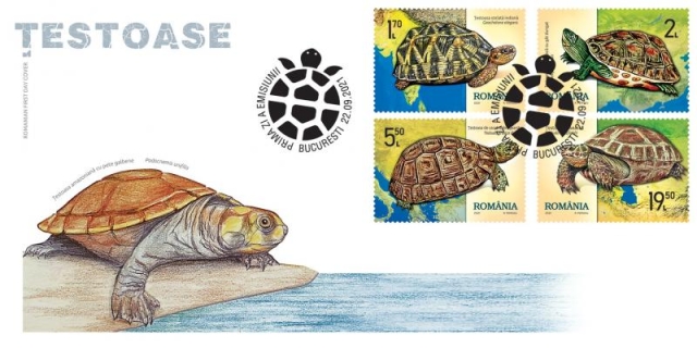 The postage stamps issue “Turtles” will be available on Wednesday, September 22nd, 2021, in Romfilatelia’s shops network in Bucharest, Bacau, Brasov, Cluj-Napoca, Iasi and Timisoara and online on http://romfilatelia.ro/store/.
